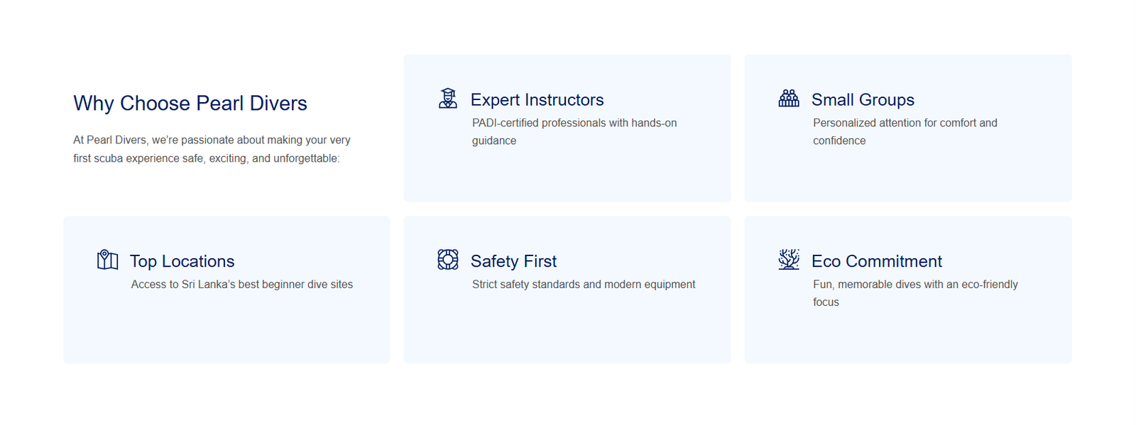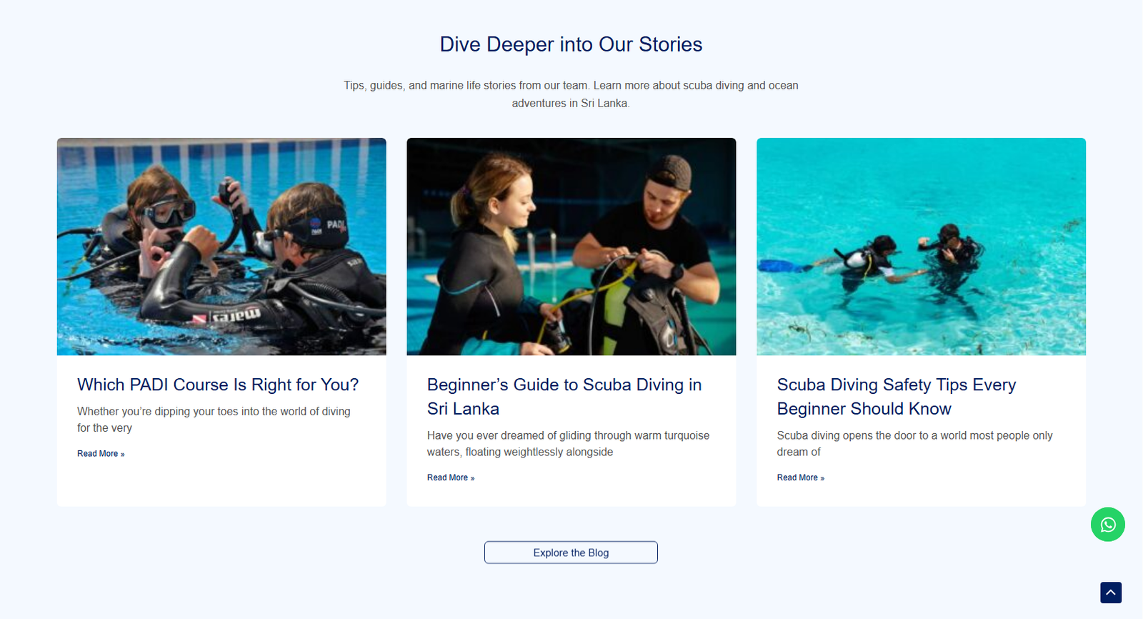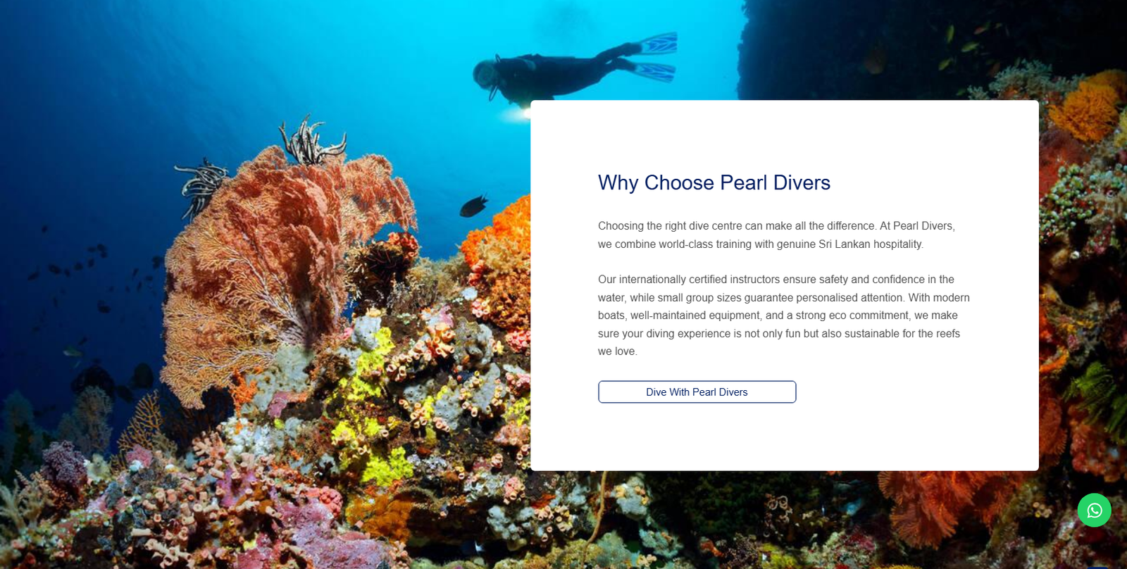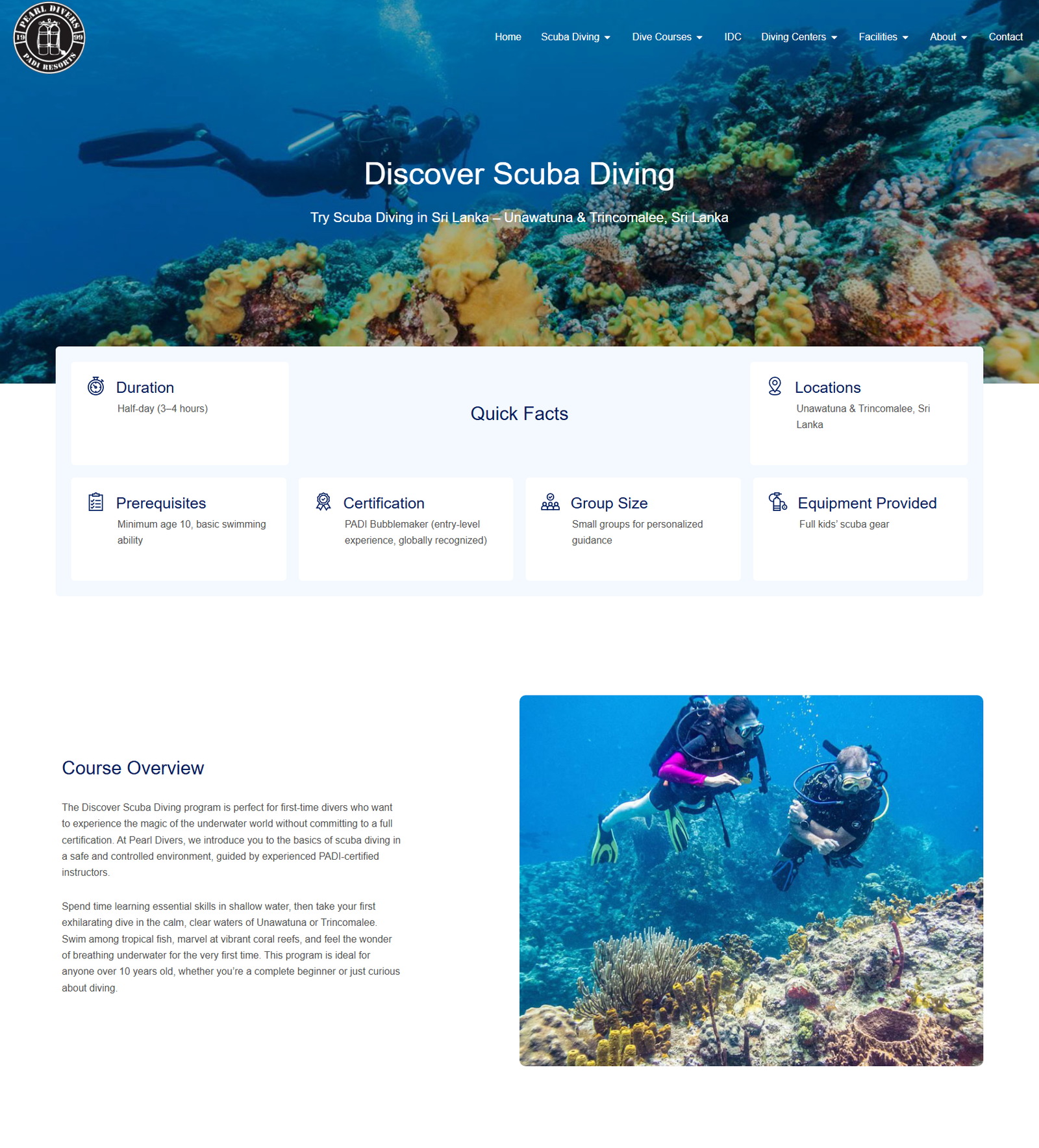 Pearl Divers delivers memorable diving experiences in Unawatuna and Trincomalee — from beginner dives to multi-dive packages. They needed a website that feels immersive, ocean-inspired, and easy for travellers to understand.